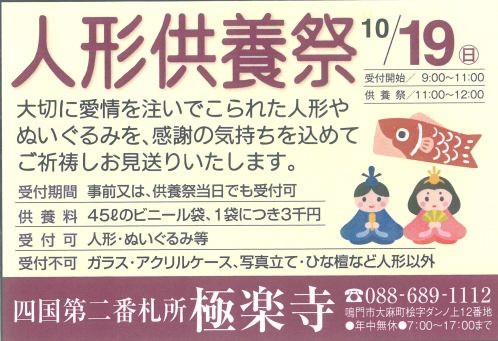 令和7年人形供養、10月19日午前11時、人形供養開始となっております。 当日お申込できない方は前日までに御持ち込いただいても大丈夫です。