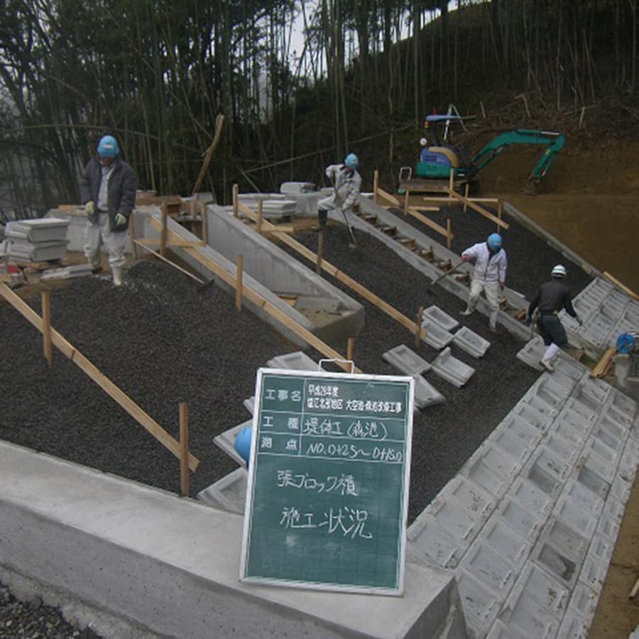 香川県は降水量が少なく渇水が多く、古くから農業用水を貯めるためのため池がたくさんあります。近年は、豪雨等により多くのため池が被災し甚大な被害が出ています。今後起こるかもしれない災害に備えて、今あるため池の法面を保護したり、老朽化したため池施設を修繕する工事です。